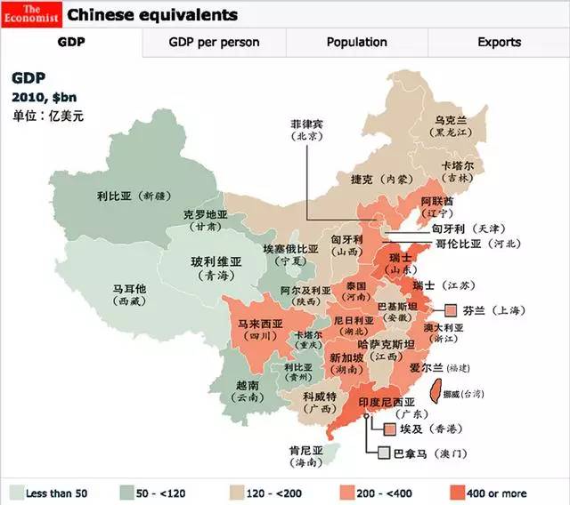 从图上可知,中国各省的名义GDP总量都可以抵得上一个国家的GDP。当年广东省的GDP为4.60万亿元人民币,经济总量和2.35亿人口的印尼GDP总量近似。而当年GDP总量为4.14万亿的江苏省和3.92万亿的山东省,都和瑞士的经济体量相近。