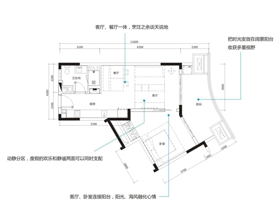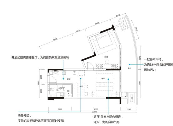 B1户型,建面约84㎡。开放式厨房连接餐厅,为假日的欢聚增添美味。动静分区,度假的欢笑和静谧两面可以同时支配。客厅、卧室与阳台相连,送来山海的自然气息。藤木吊椅,为约9.6米阳台的开阔视野,添加活力。