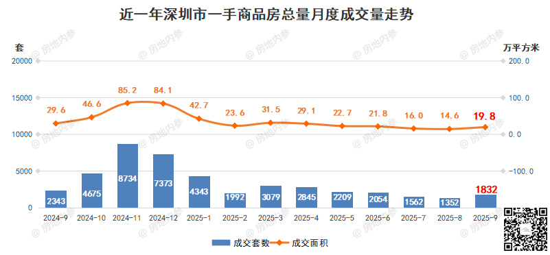 2025年9月,深圳全市开发商品房共成交1832套,环比↑35.50%;成交面积197762.56㎡,环比↑35.41%。
