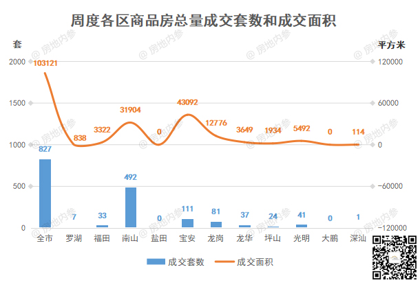 深圳全市开发商品房共成交827套,环比↑20.91%;成交面积103120.91㎡,环比↓42.15%。