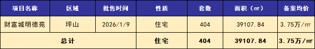 本周共1个项目获批预售,住宅批售共404套,面积约3.9万平米。