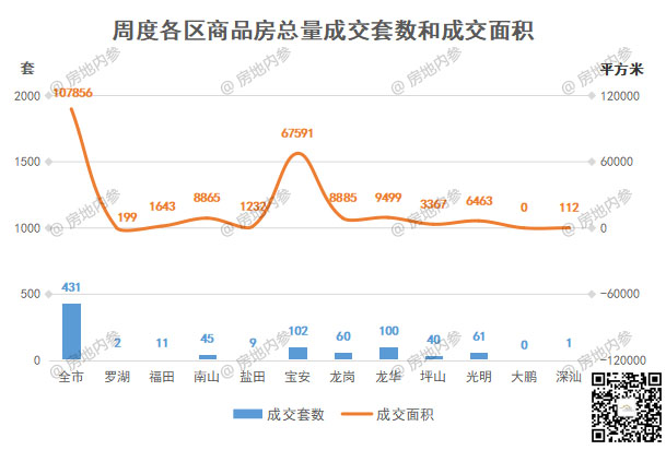 深圳全市开发商品房共成交431套,环比↑8.02%;成交面积107855.98㎡,环比↑104.07%。