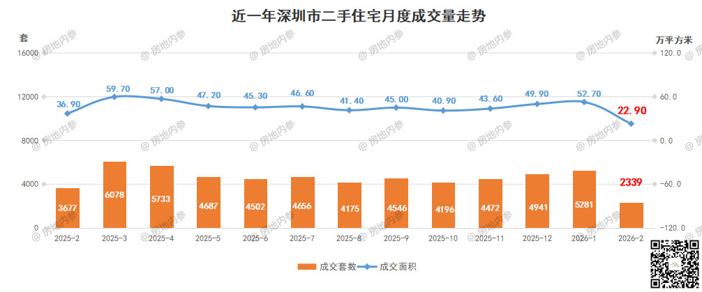 根据@房地内参 监测,2月深圳全市二手房成交3025套,环比↓54.59%,成交面积约278545㎡,环比↓56.17%,其中住宅成交2339套,环比↑55.71%,住宅成交面积约228745㎡,环比↑56.56%。