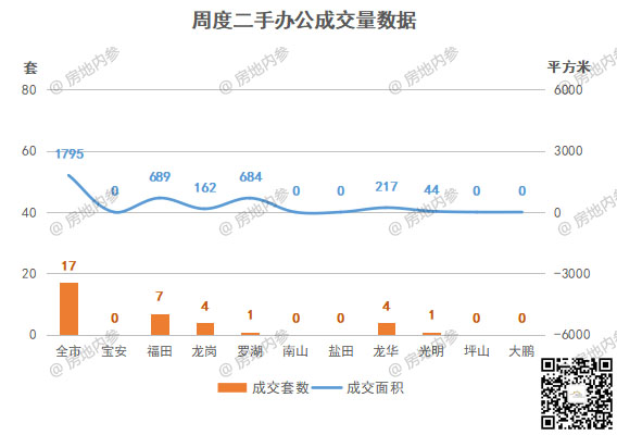 二手房办公成交方面,全市成交17套,成交量前三区域分别是: