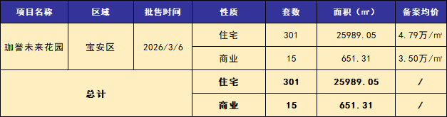 ■本周共1个项目获批预售,其中住宅批售共301套,面积约2.60万平米。