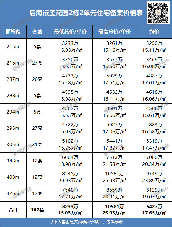 ♦备案产品:162套住宅,户型建面约215-426㎡,备案均价17.65万/㎡