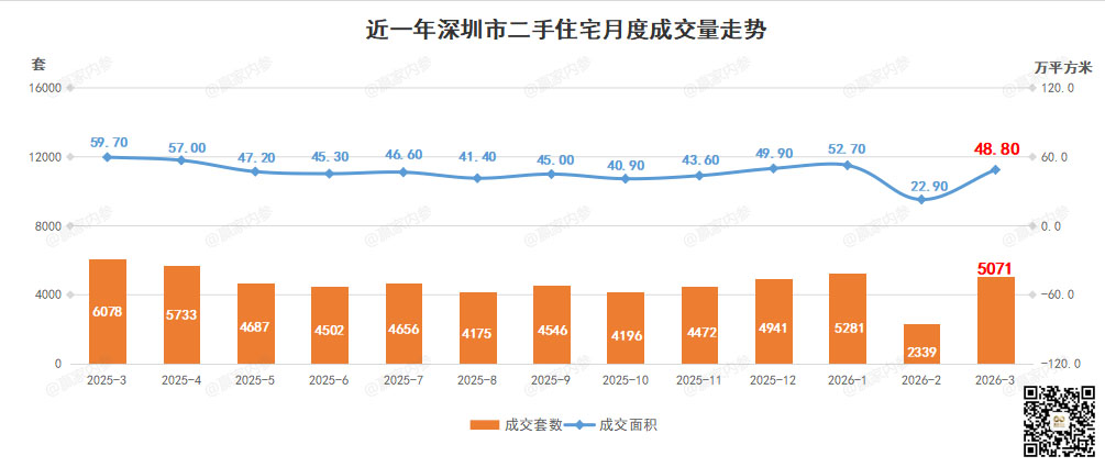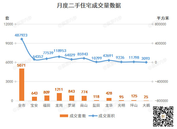 根据@赢家内参 监测,3月深圳全市二手房成交6770套,环比↑123.80%,成交面积约579425㎡,环比↑108.02%,其中住宅成交5071套,环比↑116.80%,住宅成交面积约487923㎡,环比↑113.30%。