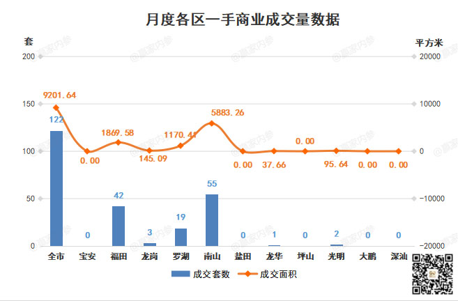 ②商业,成交122套,环比↓74.79%;成交面积9201.64㎡,环比↓61.39%;
