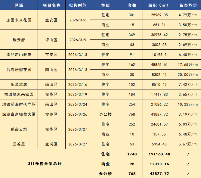 2026年3月,深圳全市一二手商品房成交简要: