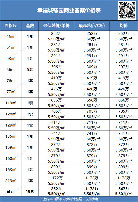18套商业,户型建面约46-213㎡,备案均价5.50万/㎡
