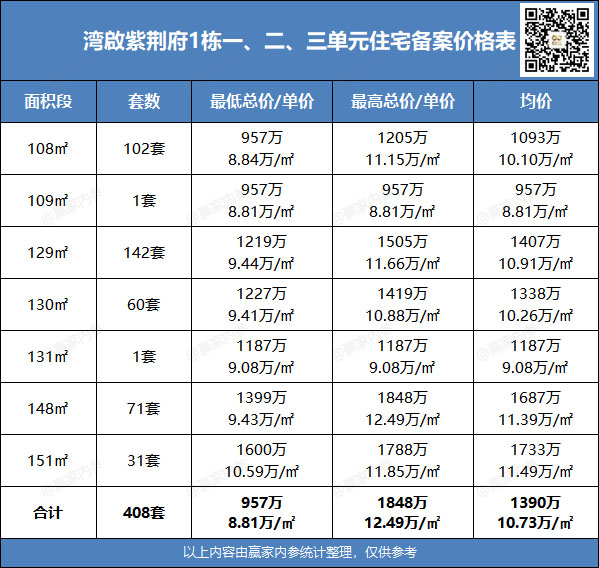 ♦备案产品:408套住宅,户型建面约108-151㎡,备案均价10.73万/㎡