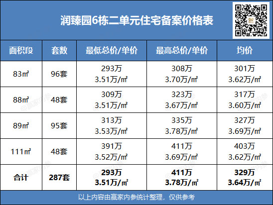 ♦备案产品:287套住宅,户型建面约83-111㎡,备案均价3.64万/㎡