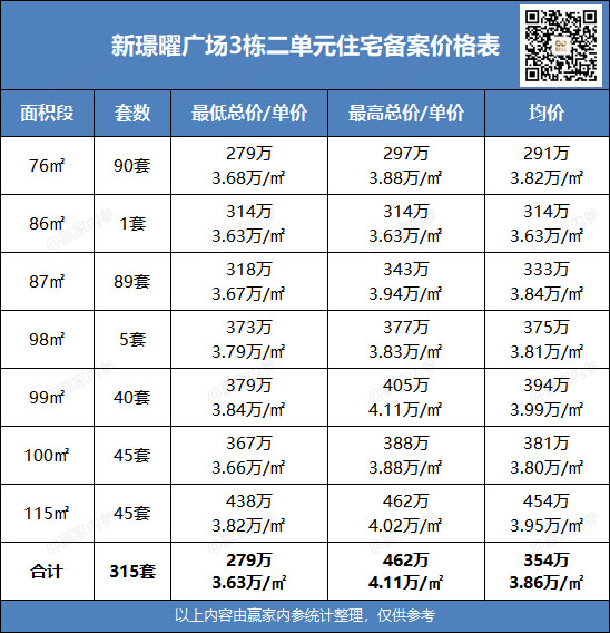 ♦备案产品:315套住宅,户型建面约76-115㎡,备案均价3.86万/㎡