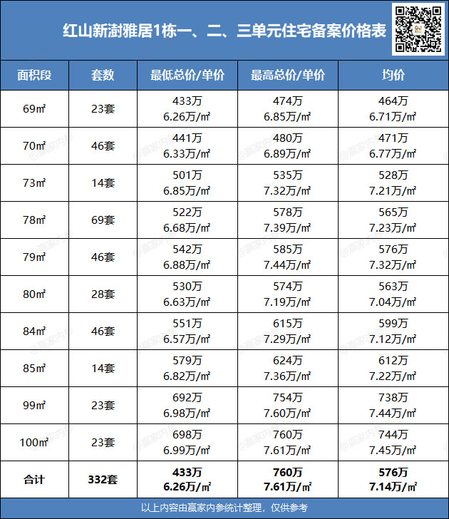 ♦备案产品:332套住宅,户型建面约69-100㎡,备案均价7.14万/㎡