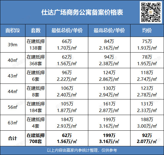 ♦备案产品:708套商务公寓,户型建面约39-63㎡,备案均价2.07万/㎡