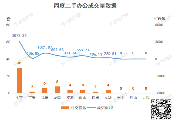 二手房办公成交方面,全市成交30套,成交量前三区域分别是: