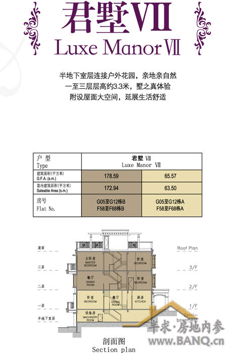 七、观湖园·君墅Ⅶ,建面约244平方米,临岛坡地设计。半地下室连接户外花园,亲地接近自然,生活倍显色彩化。一至三层,每层层高约3.3米,配备大面积露台,阔绰主卧设计,彰显主人尊贵身份,处处体验真正墅式生活。顶层还附设屋面大空间,随业主发挥创意打造,再次延展生活舒适空间。