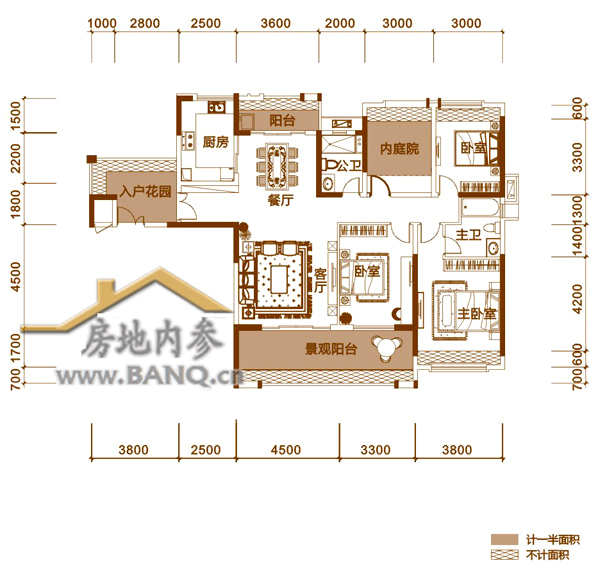 P户型赠送面积约32.62㎡,赠送面积最大的为景观阳台,达到约12.06㎡,而最少的则为餐厅外阳台,也有2.64㎡;同样方正实用的内庭院和入户花园,不免也是一个发挥想象的机会。当中有一个亮点也是无法避免的,就是客厅、餐厅双出阳台,这样通风、采光就能达到极致。