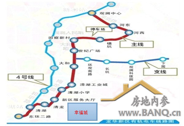 全深圳第一条有轨电车与地铁4号线就在幸福城旁边对接,线路起自4号线清湖站南东环二路,沿和平路—清龙路—梅龙路—大和路—观澜人民路—平安路至观澜中心站,线路长9.1公里。建成后将南北龙华贯穿一体。东环一路至观澜段预计2014年开通。届时,地铁口、以及地铁与有轨电车换乘点的交通优势引导下,项目将汇集更多的人流,成为人气旺地。