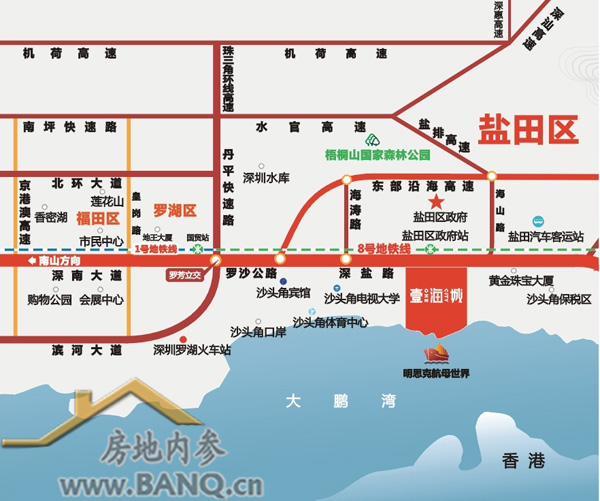 打开地图,可以看到的是,如今的盐田,处于深圳南部发展带的东部滨海分区,与香港接壤,是深港一体化的桥头堡。盐田区目前有沙头角口岸和即将投资14亿元兴建的莲塘口岸。在两大口岸推动下,深港一体化逐渐加强,盐田与香港连成一线,盐田将成为继福田口岸、深圳湾口岸后。受惠于深港共融的口岸重要高端住区,物业价值将一步一步与香港看齐。