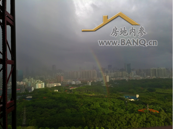 在前海东岸爬楼当天,恰是晴雨天气,站在28楼建筑主体考察时,震撼于这座城市蜕变之际,惊喜地看见雨后阳光下挂在中山公园与城市天际线之间的七色彩虹。试想下,未来业主们居住在此,时不时在自家阳台、窗边都能看见这样的美景,欢愉之情不言而喻。