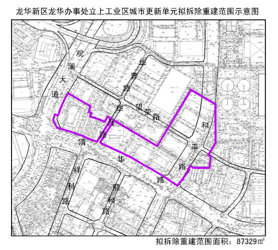 龙华办事处立上工业区城市更新单元,申报主体深圳市铭兴实业集团有限公司,拟拆除重建用地面积87329平方米,拟更新方向为居住、商业、新型产业等功能;拟拆除重建用地范围内应落实用地面积不小于8785平方米的政府社团用地、不小于3213平方米的污水处理用地及不小于2829平方米的河道用地。