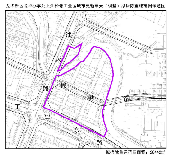 龙华办事处上油松老工业区城市更新单元(调整),申报主体深圳市龙华上油松股份合作公司,拟拆除重建用地面积28442平方米,拟更新方向为居住、商业等功能;拆除重建用地范围内应落实用地面积不小于9699平方米的公共利益用地。