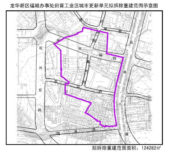 福城办事处田背工业区城市更新单元,申报主体深圳市合正房地产集团有限公司,拟拆除重建用地面积124282平方米,拟更新方向为居住、新型产业等功能。拟拆除重建用地范围内需按法定图则确定的用地规模落实九年一贯制学校用地一处。