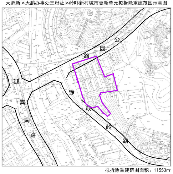 大鹏办事处王母社区岭吓新村城市更新单元,申报主体深圳市大鹏岭吓股份合作公司,拟拆除重建用地面积11553平方米,拟更新方向为居住等功能;拆除重建用地范围内应落实面积不小于752平方米公园绿地。