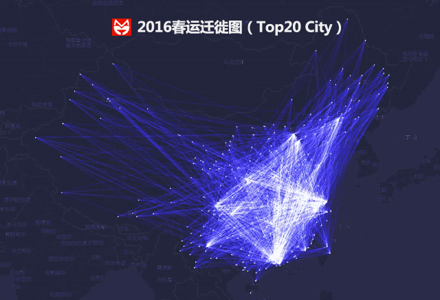 这是一张由2016年春运迁徙大数据所绘制出的全国春节期间人口流动图景,这幅波澜壮阔的图景,不仅描绘了人类迄今为止规模最大的迁徙活动,更重要的是,每一个人都用自己的足迹和选择,描绘出了中国各个城市的地位、等级、关系与纠葛。