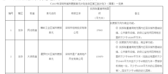 12月8日,2017年深圳市城市更新单元计划龙华区第三批计划在网上公示,一共有2个项目纳入计划,拟拆除重建用地面积16万平。