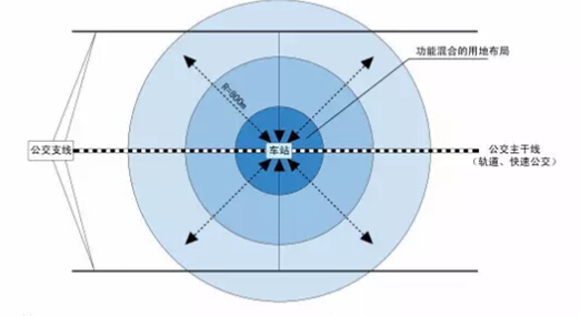 所谓的TOD模式,指的是以公共交通为导向,通过地铁、轻轨等轨道交通及巴士干线,建立起以400~800m(5—10分钟步行路程)为半径的集工作、商业、文化、教育、居住等为一体的城区开发模式。由新城市主义代表人物彼得·卡尔索尔普所提出,用于解决二战后美国城市的无限制蔓延而采取的一种方式。