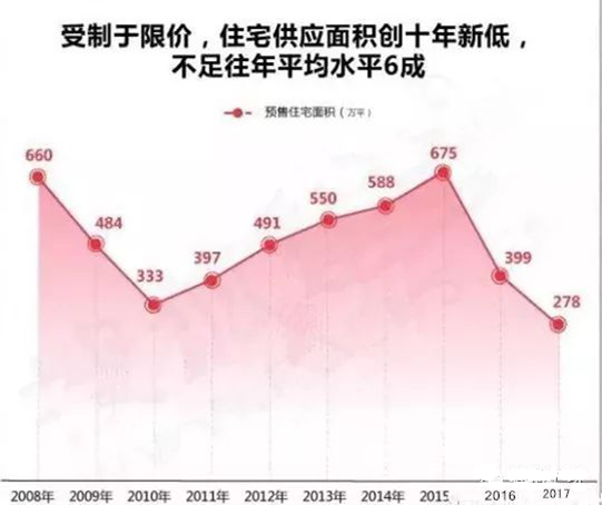 2017年深圳一手住宅预售项目供给量27324套,为6年来最低。资料显示,2008年-2017年的10年间,深圳住宅预售面积有两个高峰,分别是2008年的660万套以及2015年的675万套,而2017年住宅预售仅有278万㎡,创下10年以来的最低水平。