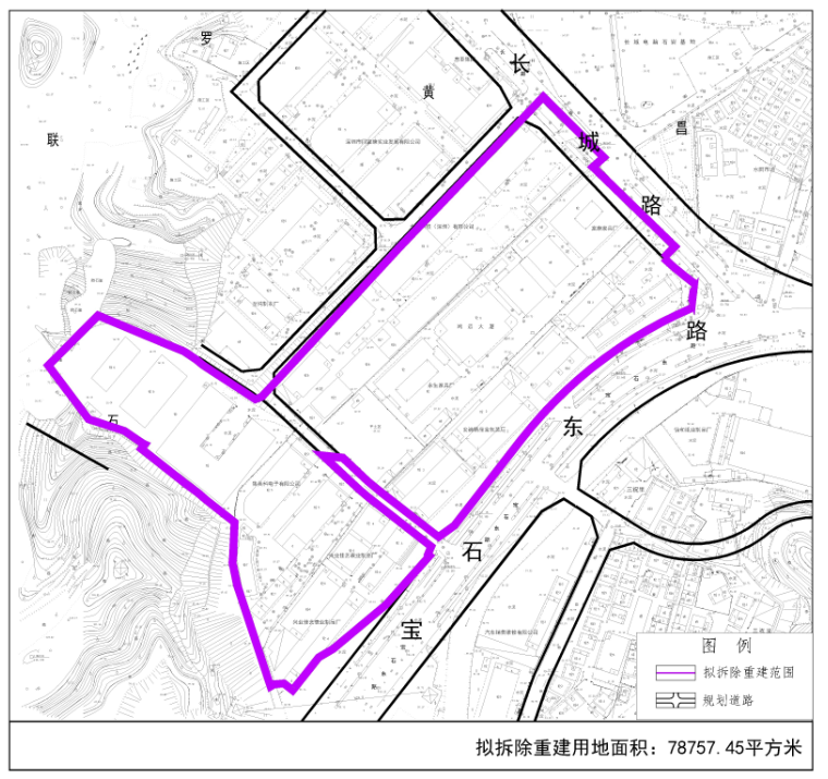 图示为长城路西侧工业片区城市更新单元拟拆除重建范围示意图