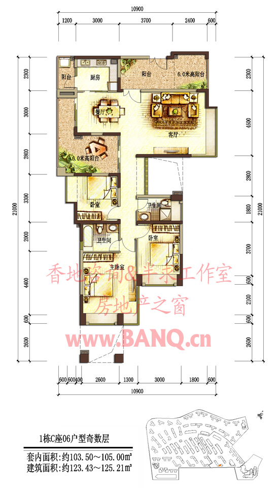 1栋C座06户型奇数层;套内面积约103.50~105.00平方米,建筑面积约123.43~125.21平方米