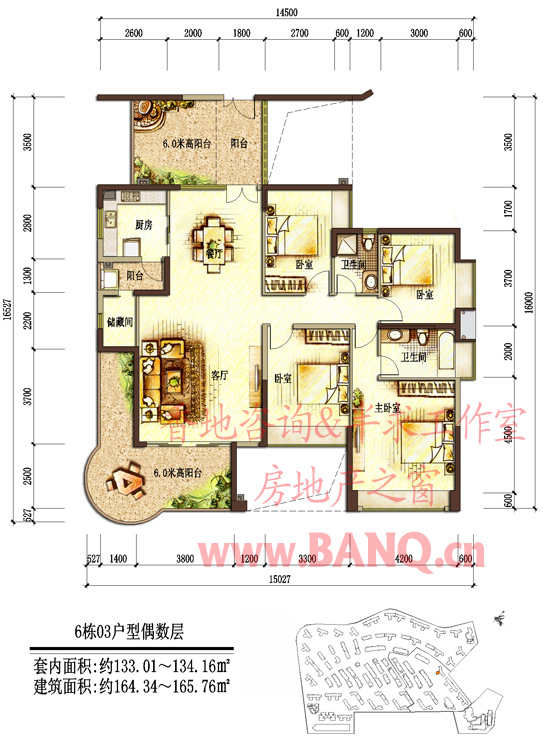 6栋03户型偶数层;套内面积约133.01~134.16平方米,建筑面积约164.34~165.76平方米