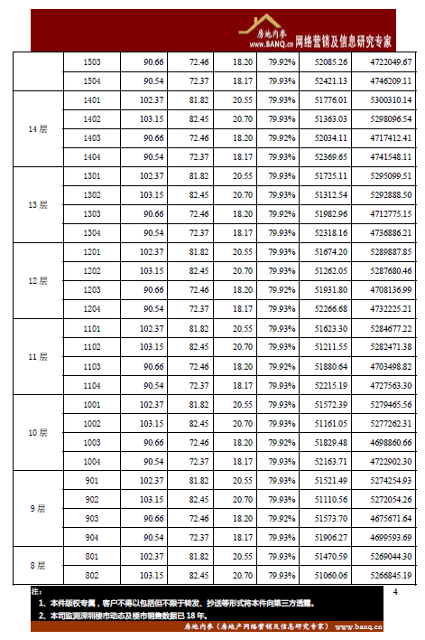 龙岗区仁恒四季园1~5 栋住宅、商业开盘备案价格表