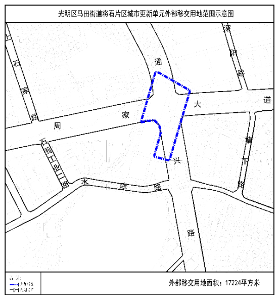公示还规定:拟拆除重建用地范围内应无偿移交的独立用地47987.4平方米,应落实不小于8700平方米的教育设施用地和不少于7458.1平方米的公共绿地;拟拆除重建用地范围北侧4220平方米的用地须无偿移交政府;周家大道与通兴路交叉口17223.59平方米用地作为外部移交用地参与本次城市更新,计入合法用地面积9472.97平方米。