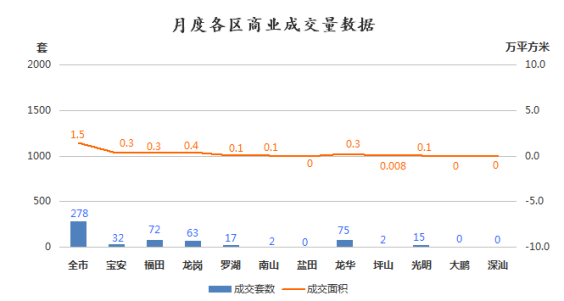 商业,成交278套,环比下跌42.92%;成交面积14707.34㎡,环比下跌48.48%;