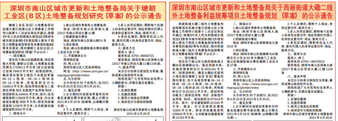 4月20日,南山区城市更新和土地整备局发布关于西丽街道大磡二线外土地整备利益统筹项目、桃源街道塘朗工业区(B区)等两个项目土地整备规划(草案)的公示通告。