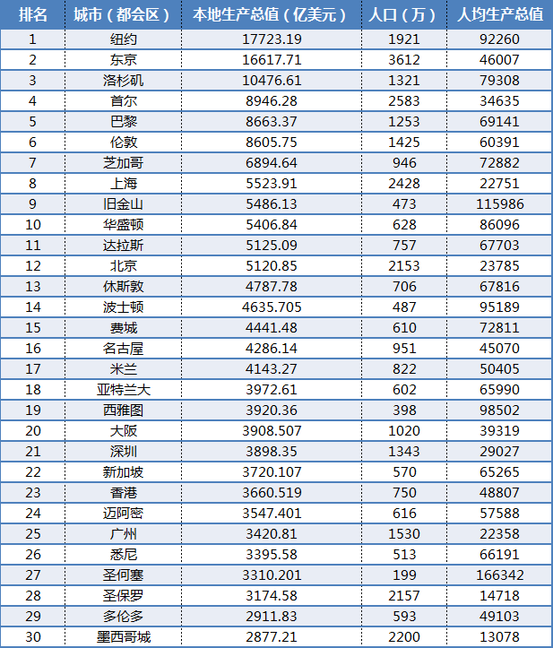 (2020年世界主要城市GDP前30)