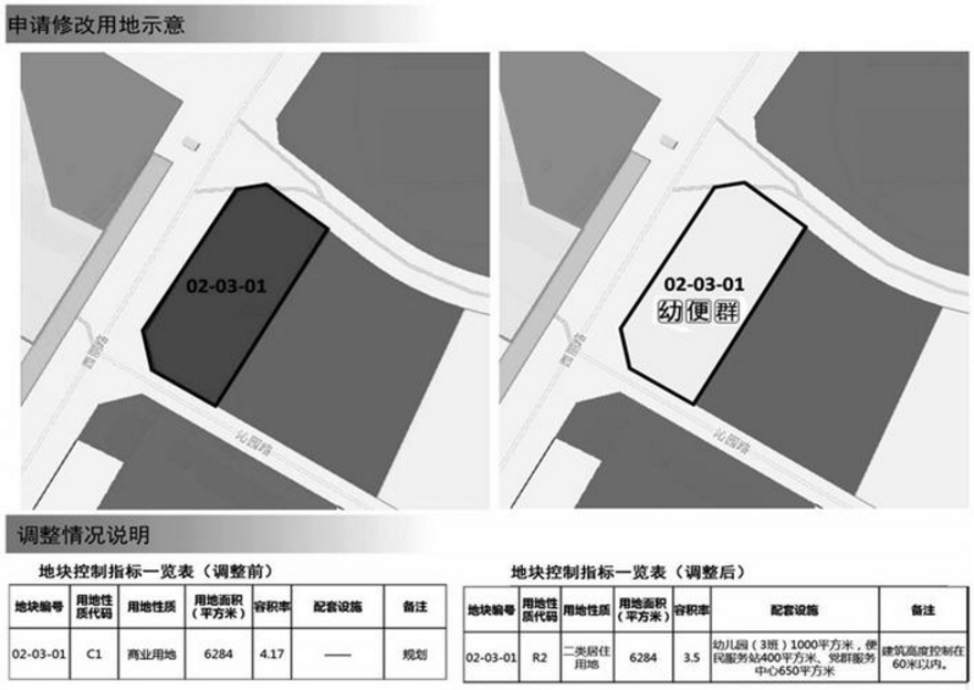 原该地规划为商业用地,调整为二类居住用地,容积率3.5,计容积率建筑面积约2.2万平方米,配建幼儿园(3班)1000平方米,便民服务站400平方米、党群服务中心650平方米,建筑高度控制在60米以内,约20层左右。
