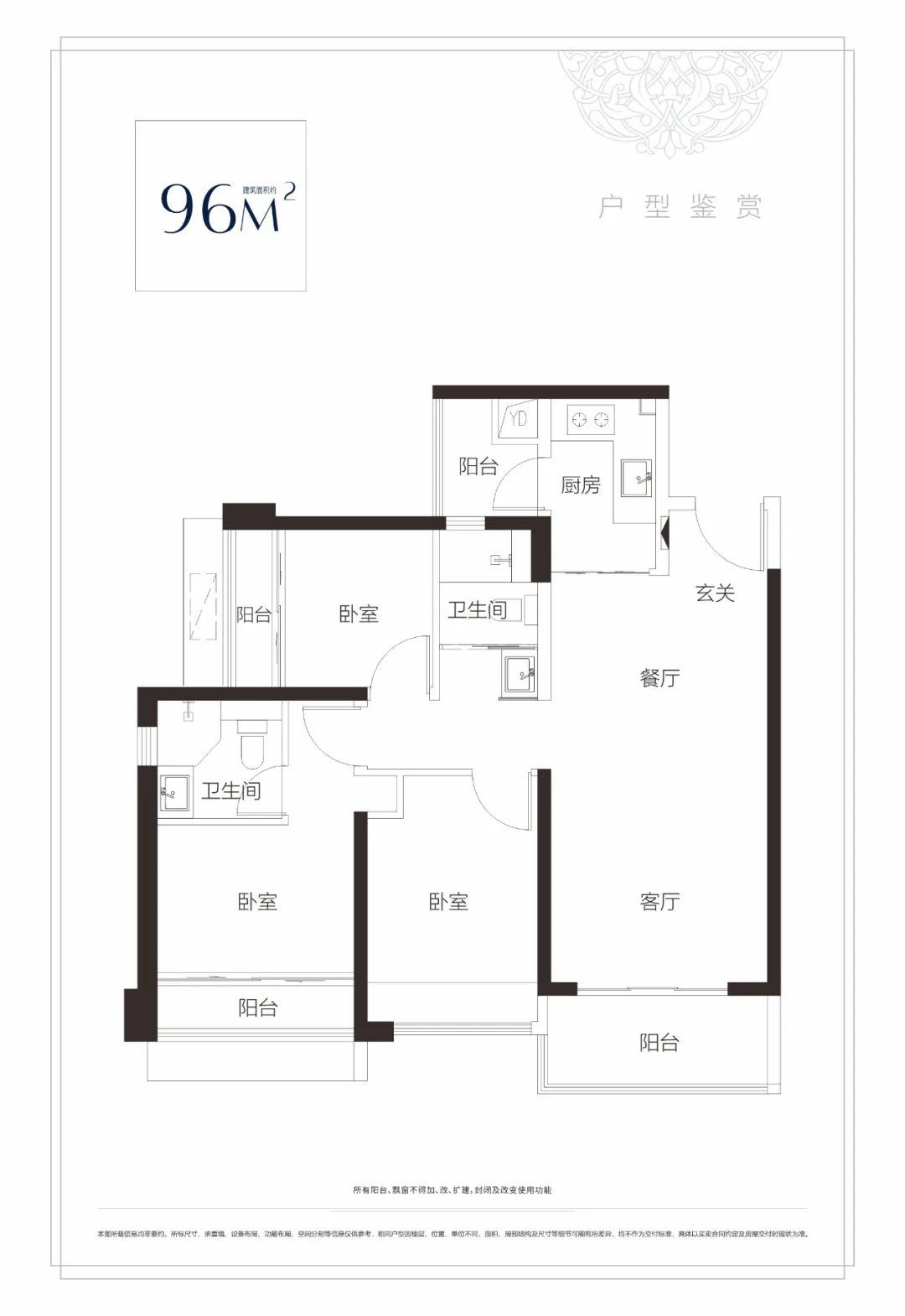 建面约96㎡3房2厅2卫户型 厨房、餐厅与客厅、阳台纵向联动,空间性功能性巧妙平衡,居住更人性化。