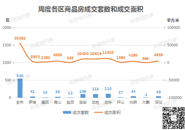 深圳全市开发商品房共成交548套,环比↑14.88%;成交面积55802.18㎡,环比↑16.10%