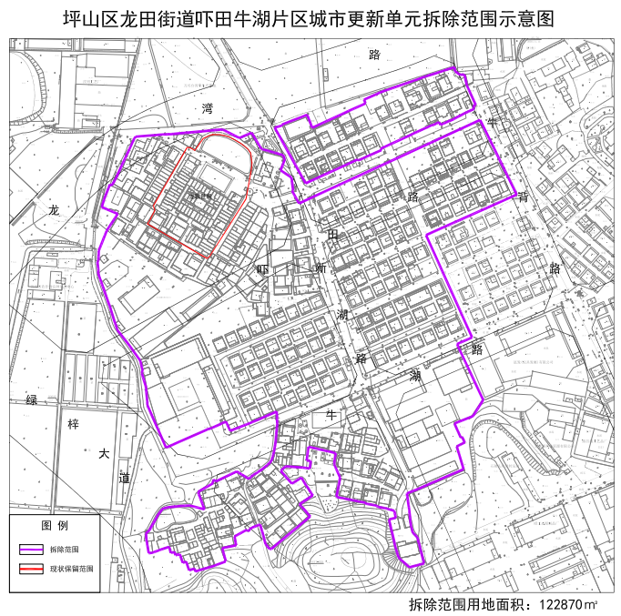 吓田牛湖片区城市更新单元已列入《2022年深圳市坪山区城市更新单元第一批计划》,项目位于坪山区龙田街道龙田社区,牛背路与吓田二路交汇处西南侧,项目拟拆除范围用地面积为122870㎡。