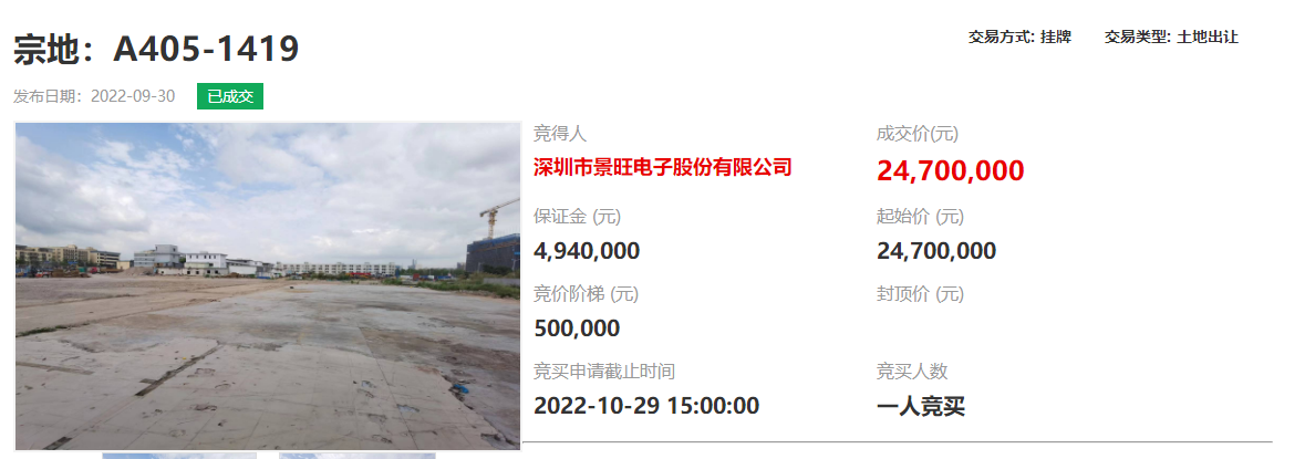 10月31日下午,宝安区以成交价2740万元成功出让重点产业项目用地A405-1419,由宝安上市企业深圳市景旺电子股份有限公司竞得,将建设宝安半导体封装基板及高端高密度印制电路智能制造基地项目。