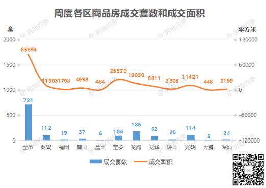 深圳全市开发商品房共成交724套,环比↓19.82%;成交面积85893.93㎡,环比↓3.20%