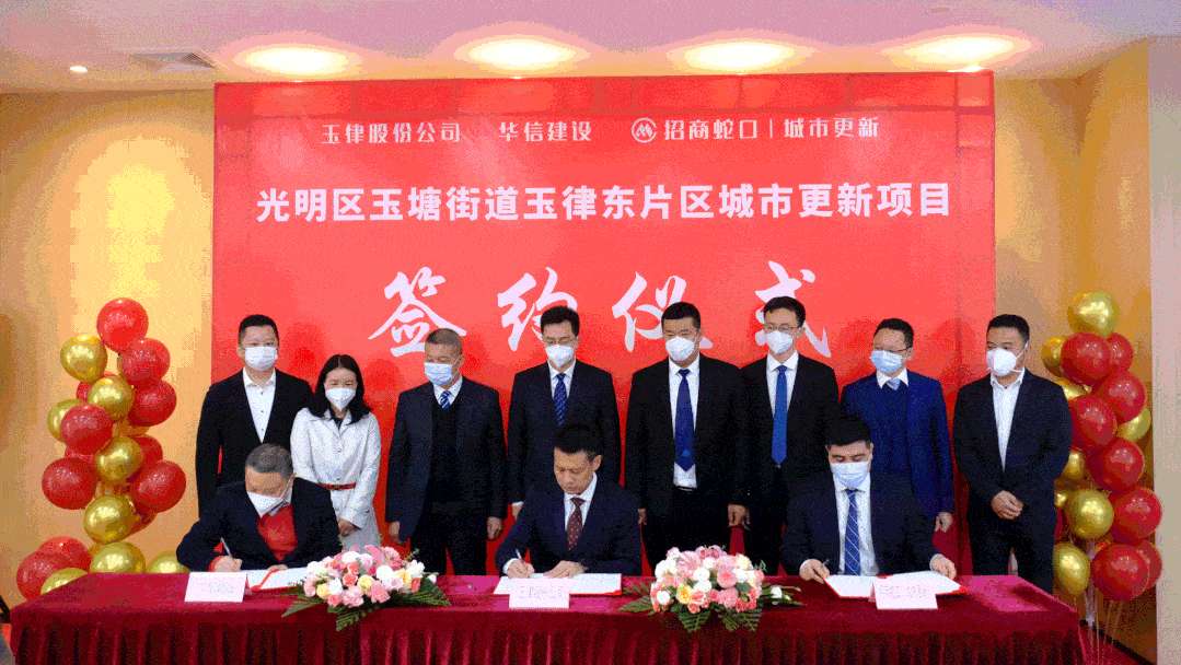 近日,招商蛇口与深圳市公明玉律股份合作公司、深圳市华信建设发展有限公司举行签约仪式,据此正式成为光明区玉塘街道玉律东片区城市更新项目前期服务商。