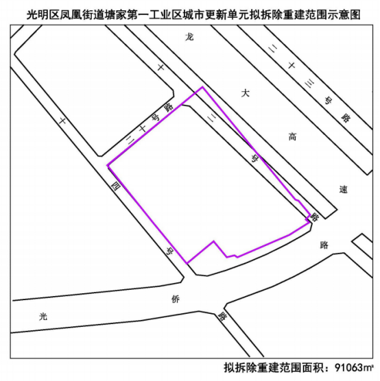 另一个塘家第一工业区更新项目,位于凤凰街道光桥路北侧,龙大高速西侧。拟拆除重建用地面积91063㎡,更新方向为M1+M0。其中,原普通工业用地面积不低于最终批准的工业开发建设用地面积的30%,且规划普通工业厂房建筑面积不得低于10万㎡。