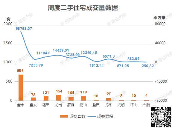 根据@房地内参 监测,上周深圳全市二手房成交858套,环比↑3.13%,成交面积约76270.43㎡,环比↓0.62%,其中住宅成交684套,环比↓6.43%,住宅成交面积约63793.07㎡,环比↓9.40%。